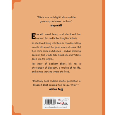 “Faith hero Elisabeth Elliot’s life story will entertain, amaze, and inspire children from 4 to 7 and beyond, while it plants dreams of new adventures for God.“